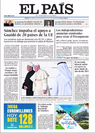 EL PAÍS: "Sánchez impulsa el apoyo a Guaidó de 20 países de la UE"; "La réplica a Trump: negra, escritora y de origen humilde"; "El Papa defiende la libertad religiosa en la península arábiga"; "Los independentistas anuncian enmiendas para vetar el Presupuesto"; "El mercado laboral sufrió en enero su peor inicio de año desde 2013"; "Un robot acaba la 'Sinfonía inacabada' de Schubert".