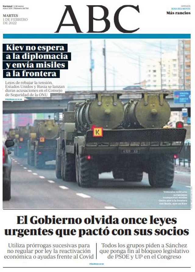 ABC: "Kiev no espera a la diplomacia y envía misiles a la frontera"; "El Gobierno olvida once leyes urgentes que pactó con sus socios".