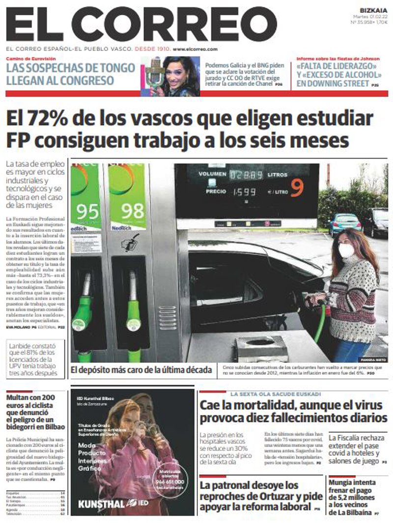EL CORREO: "El 72% de los vascos que eligen estudiar FP consiguen trabajo a los seis meses"; "Cae la mortalidad, aunque el virus provoca diez fallecimientos diarios"; "La patronal desoye los reproches de Ortuzar y pide apoyar la reforma laboral"; "Mungia intenta frenar el pago de 5,2 millones a los vecinos de La Bilbaína".