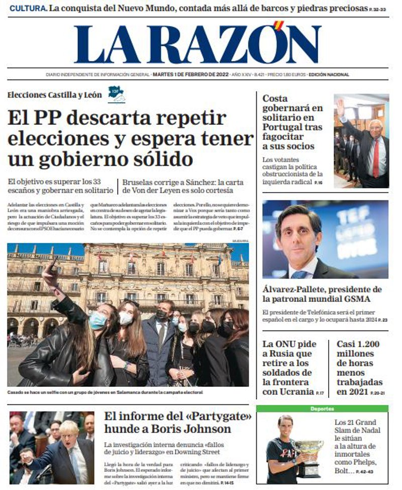 LA RAZÓN: "El PP descarta repetir elecciones y espera tener un gobierno sólido"; "El informe del 'Partygate' hunde a Boris Johnson"; "Costa gobernará en solitario en Portugal tras fagocitar a sus socios"; "Álvarez-Pallete, presidente de la patronal mundial GSMA"; "La ONU pide a Rusia que retire a los soldados de la frontera con Ucrania"; "Casi 1.200 millones de horas menos trabajadas en 2021"; "Los 21 Grand Slam de Nadal le sitúan a la altura de inmortales como Phelps, Bolt...".