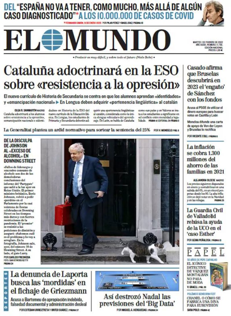 EL MUNDO: "Cataluña adoctrinará en la ESO sobre 'resistencia a la opresión'"; "La disculpa de Johnson al 'exceso de alcohol' en Downing Street"; "La denuncia de Laporta busca las 'mordidas' en el fichaje de Griezmann"; "Así destrozó Nadal las previsiones del 'Big Data'"; "Casado afirma que Bruselas descubrirá en 2023 en 'engaño' de Sánchez con los fondos"; "La inflación se cobra 1300 millones de ahorro de las familias en 2021"; "La Guardia Civil de Valladolid rehúsa la ayuda de la UCO en el 'caso Esther'".