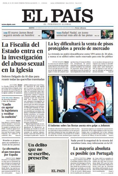EL PAÍS: "La Fiscalía del Estado entra en la investigación del abuso sexual en la Iglesia"; "La ley dificultará la venta de pisos protegidos a precio de mercado"; "La mayoría absoluta es posible (en Portugal)"; ""Confío en agotar la legislatura y reeditar la coalición""; "La alternativa al gas ruso pasa por España".
