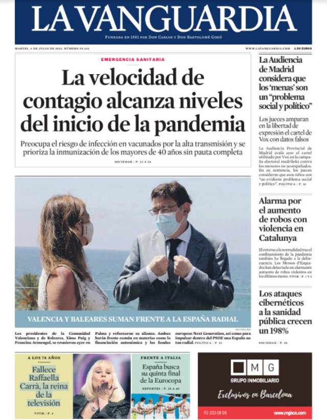 LA VANGUARDIA: "La velocidad de contagio alcanza niveles del inicio de la pandemia"; "La Audiencia de Madrid considera que los'menas'son un"problema social y político""; "Alarma por el aumento de robos con violencia en Catalunya"; "Los ataques cibernéticos a la sanidad pública crecen un 198%"; "Fallece Raffaella Carrà, la reina de la televisión".
