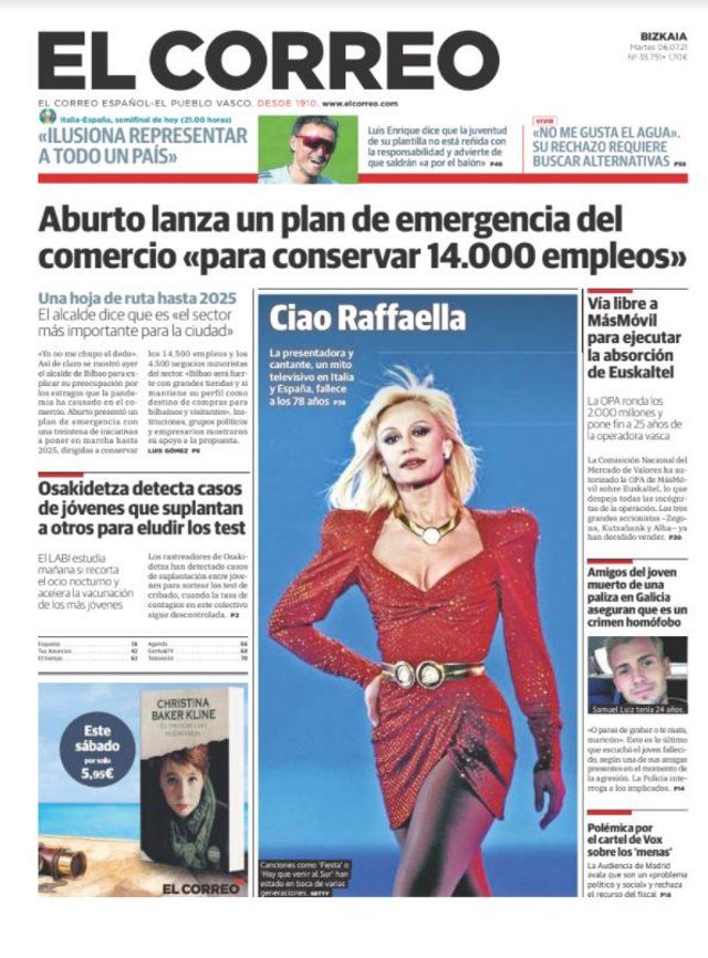 EL CORREO: "Aburto lanza un plan de emergencia del comercio 'para conservar 14.000 empleos'"; "Osakidetza detecta casos de jóvenes que suplantan a otros para eludir los test"; "Vía libre a MásMóvil para ejecutar la absorción de Euskaltel"; "Amigos del joven muerto de una paliza en Galicia aseguran que es un crimen homófobo"; "Polémica por el cartel de Vox sobre los 'menas'".