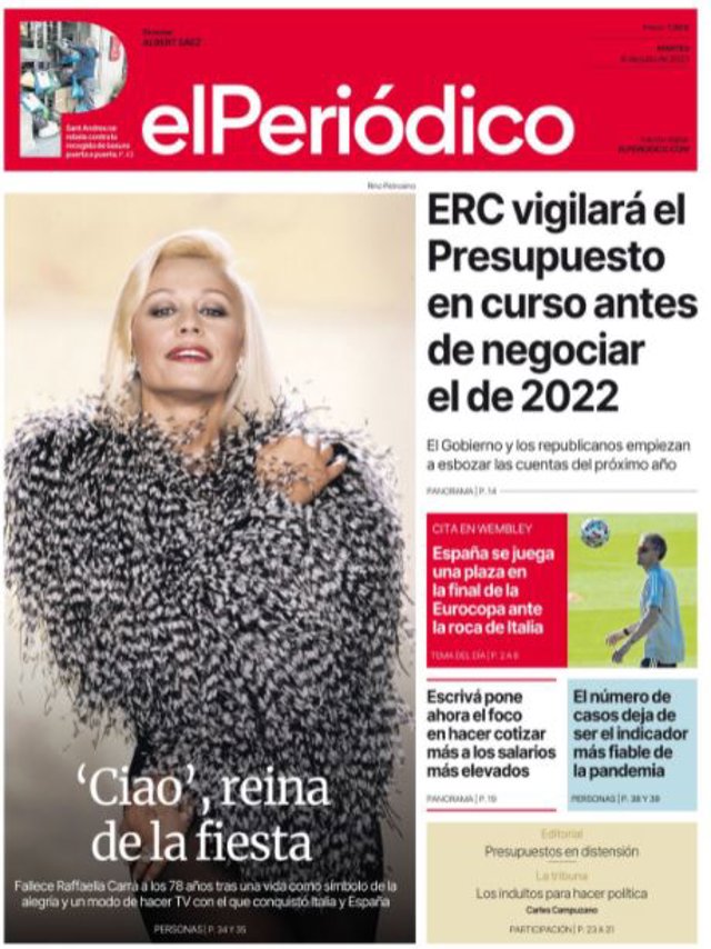 EL PERIÓDICO: "ERC vigilará el Presupuesto en curso antes de negociar el de 2022"; "'Ciao', reina de la fiesta"; "España se juega una plaza en la final de la Eurocopa ante la roca de Italia"; "Escrivá pone ahora el foco en hacer cotizar más a los salarios más elevados".