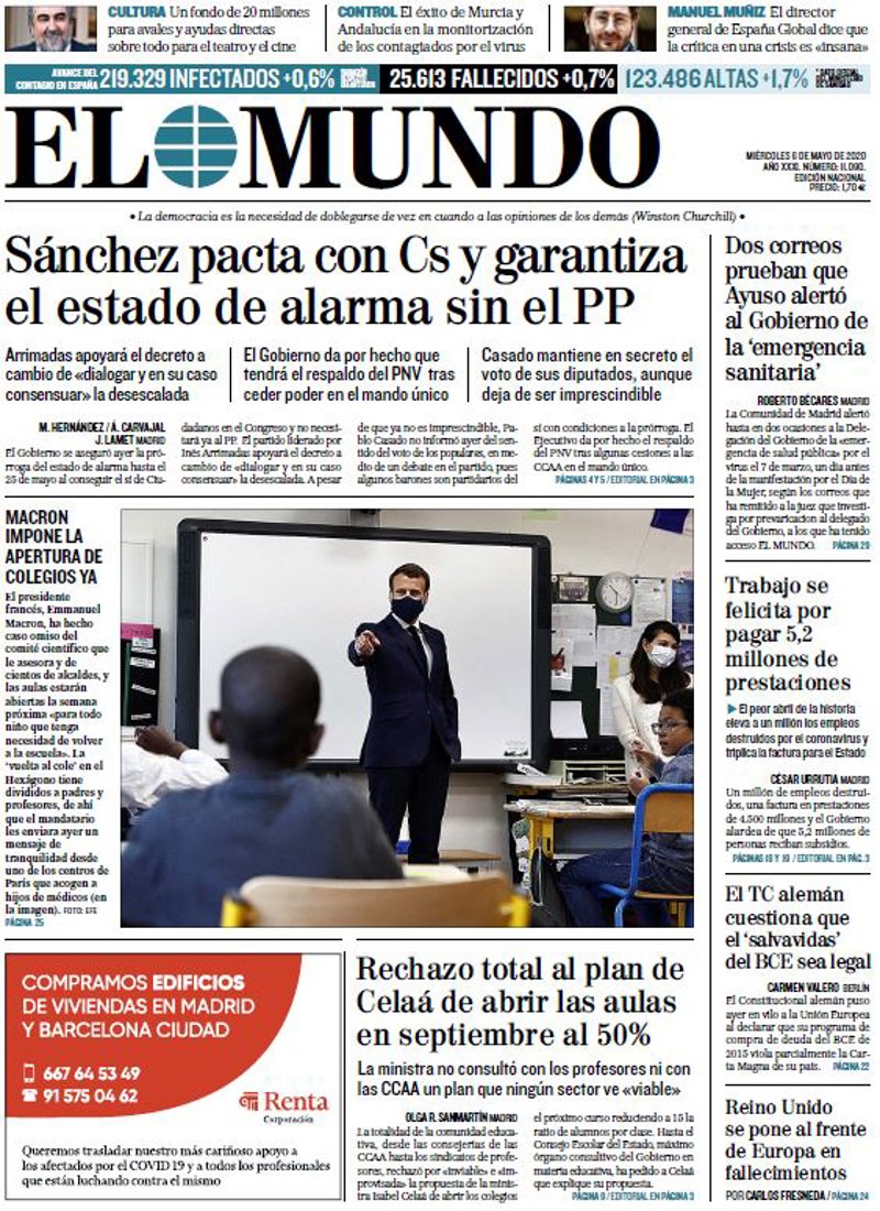 EL MUNDO: "Sánchez pacta con Cs y garantiza el estado de alarma sin el PP"; "Macron impone la apertura de los colegios ya"; "Rechazo total al plan de Celaá de abrir las aulas en septiembre al 50%"; "Dos correos prueban que Ayuso alertó al Gobierno de la 'emergencia sanitaria'"; "Trabajo se felicita por pagar 5,2 millones de prestaciones"; "El TC alemán cuestiona que el 'salvavidas' del BCE sea legal"; "Reino Unido se pone al frente de Europa en fallecimientos".