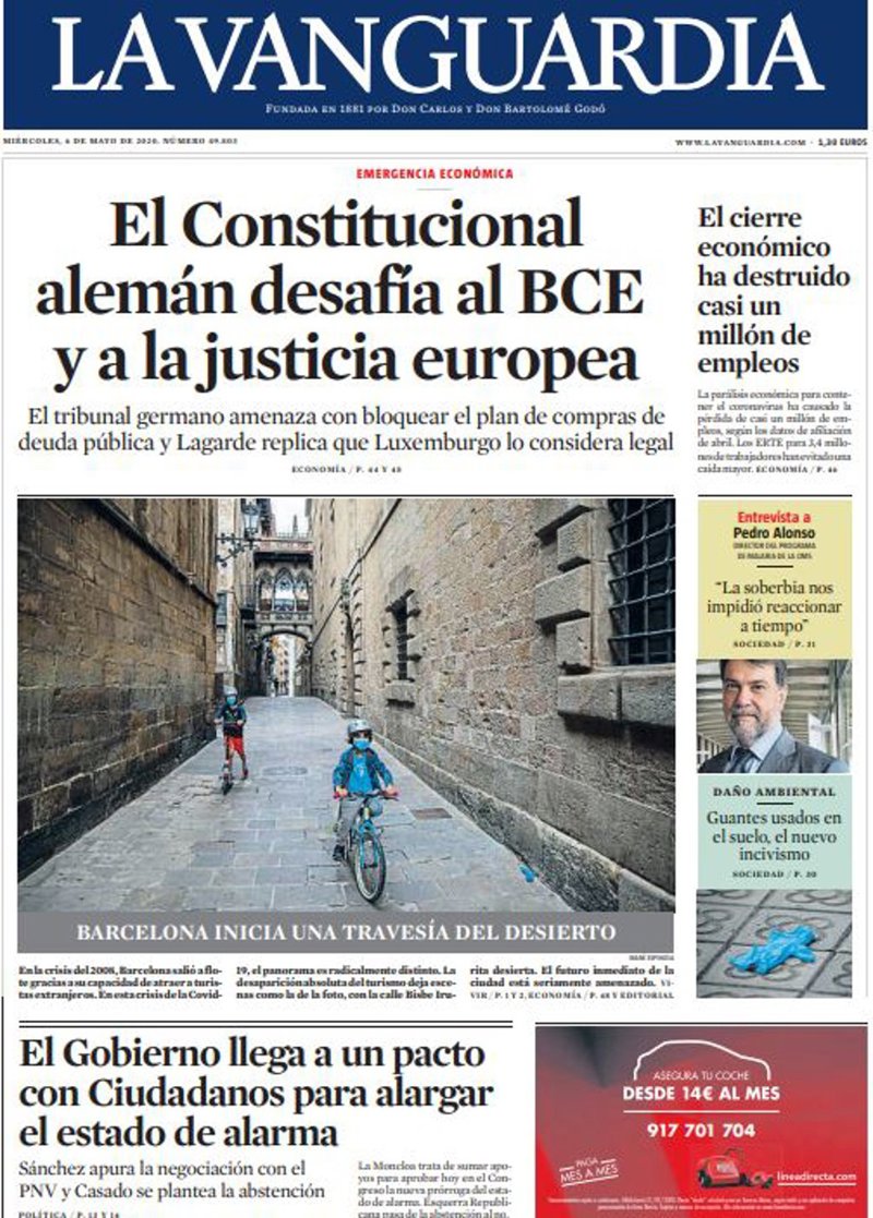 LA VANGUARDIA: "El Constitucional alemán desafía al BCE y a la justicia europea"; "El cierre económico ha destruido casi un millón de empleos"; "El Gobierno llega a un pacto con Ciudadanos para alargar el estado de alarma. Sánchez apura la negociación con el PNV y Casado se plantea la abstención".