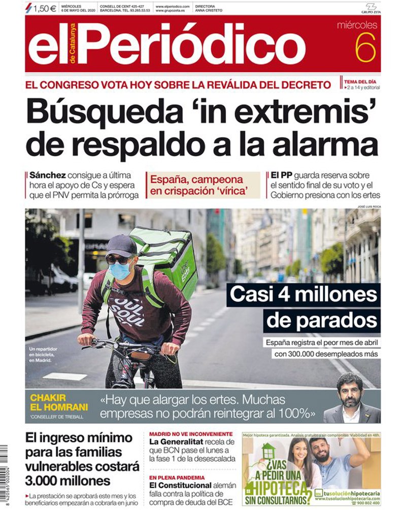 EL PERIÓDICO: "Búsqueda 'in extremis' de respaldo a la alarma"; "Casi 4 millones de parados. España registra el peor mes de abril con 300.000 desempleados más"; "El ingreso mínimo para las familias vulnerables costará 3.000 millones"; "La Generalitat recela de que Barcelona pase el lunes a la fase 1 de la desescalada"; "El Constitucional alemán falla contra la política de compra de deuda del BCE".