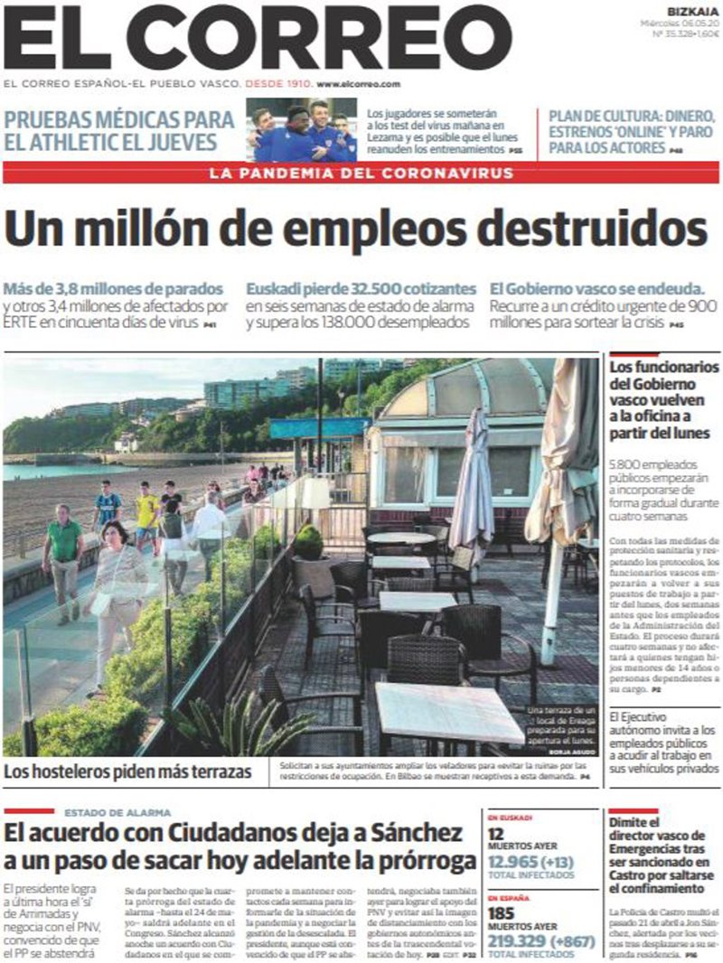 EL CORREO: "Un millón de empleos destruidos"; "El acuerdo con Ciudadanos deja a Sánchez a un paso de sacar hoy adelante la prórroga"; "Los funcionarios del Gobierno vasco vuelven a la oficina a partir del lunes"; "El Ejecutivo autónomo invita a los empleados públicos a acudir al trabajo en sus vehículos privados"; "Dimite el