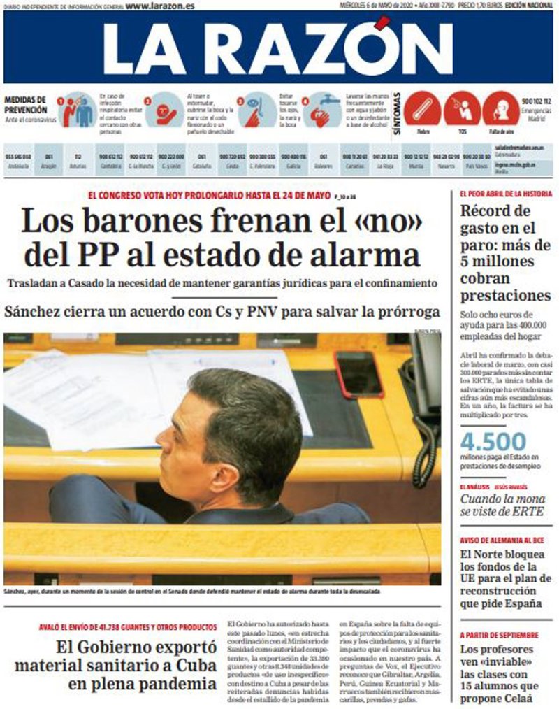 LA RAZÓN: "Los barones frenan el "no" del PP al estado de alarma"; "El Gobierno exportó material sanitario a Cuba en plena pandemia"; "Récord de gasto en el paro: más de 5 millones cobran prestaciones"; "El Norte bloquea los fondos de la UE para el plan de reconstrucción que pide España"; "Los profesores ven "inviable" las clases con 15 alumnos que propone Celaá".