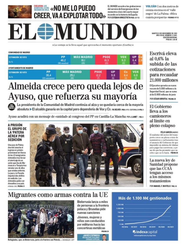 EL MUNDO: "Almeida crece pero queda lejos de Ayuso, que refuerza su mayoría"; "Escrivá eleva al 0,6% la subida de las cotizaciones para recaudar 21.000 millones"; "Migrantes como armas contra la UE"; "A prisión el grupo de la 'patera aérea' por sedición"; "El Gobierno lleva a los camioneros al límite en pleno colapso"; "La nueva ley de Sanidad propone que las CCAA tengan acceso a los mismo tratamientos".