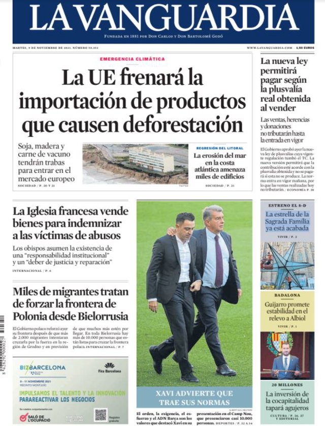 LA VANGUARDIA: "La UE frenará la importación de productos que causen deforestación"; "La nueva ley permitirá pagar según la plusvalía real obtenida al vender"; "La Iglesia francesa vende bienes para indemnizar a las víctimas de abusos"; "Miles de migrantes tratan de forzar la frontera de Polonia desde Bielorrusia"; "La estrella de la Sagrada Familia ya está acabada".