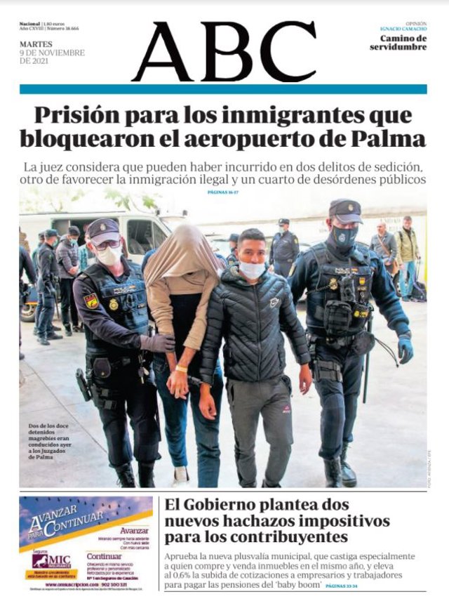 ABC: "Prisión para los inmigrantes que bloquearon el aeropuerto de Palma"; "El Gobierno plantea dos nuevos hachazos impositivos para los contribuyentes".