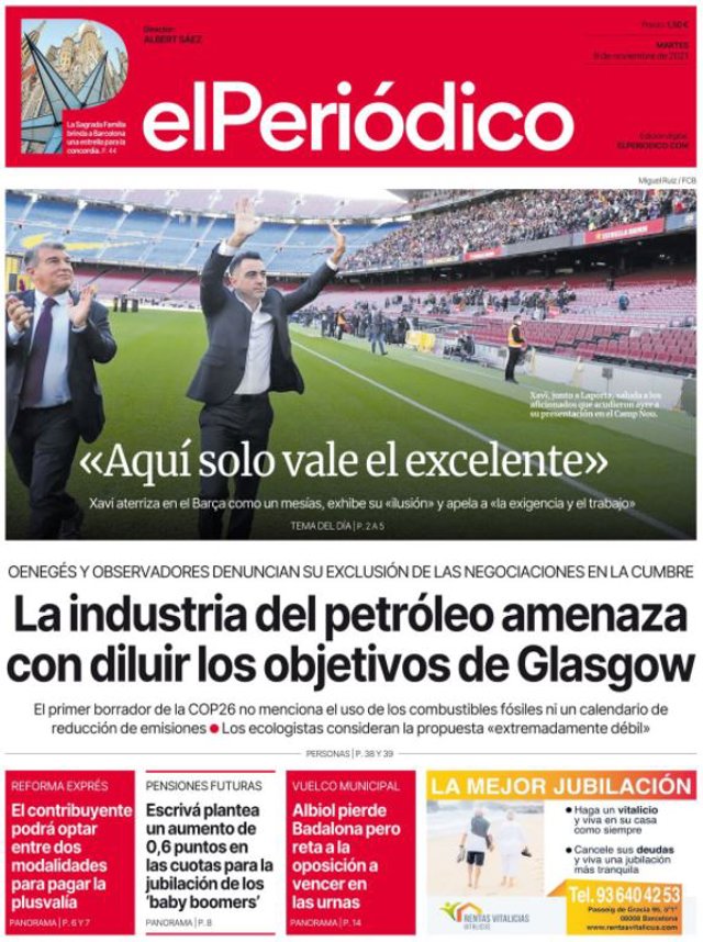 EL PERIÓDICO: "'Aquí solo vale el excelente'"; "La industria del petróleo amenaza con diluir los objetivos de Glasgow"; "El contribuyente podrá optar entre dos modalidades para pagar la plusvalía"; "Escrivá plantea un aumento de 0,6 puntos en las cuotas para la jubilación de los 'baby boomers'"; "Albiol pierde Badalona pero reta a la oposición a vencer las urnas".
