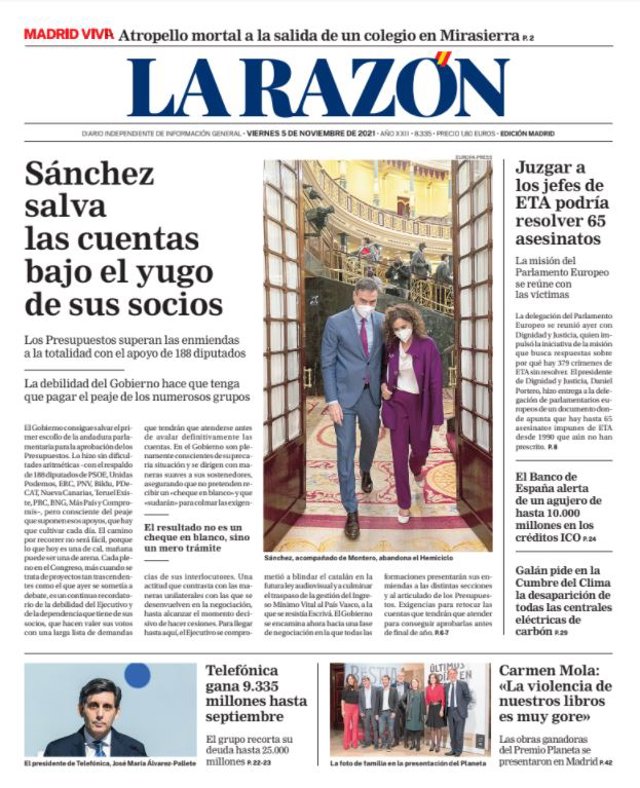 LA RAZÓN: "Fondos de la UE para oficinas de violencia de género provinciales"; "Ortega consolida la dictadura en Nicaragua con un 74,99% de los votos"; "Socialistas con Podemos, ERC, JxCat y la CUP logran echar a Albiol"; "Escrivá solivianta a los empresarios por la nueva subida de cotizaciones"; "De alta y con covid persistente: el largo calvario de los afectados"; "Xavi llega al Barça para 'poner orden'"; "Los detenidos por la 'patera aérea' van a prisión".