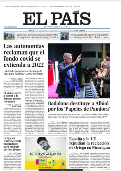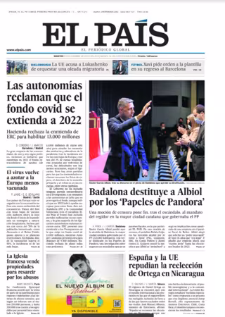 EL PAÍS: "Las autonomías reclaman que el fondo covid se extienda a 2022"; "Badalona destituye a Albiol por los 'Papeles de Pandora'"; "El virus vuelve a azotar a la Europa menos vacunada"; "España y la UE repudian la reelección de Ortega en Nicaragua"; "La Iglesia francesa vende propiedades para resarcir por los abusos"; "La UE acusa a Lukashenko de orquestar una oleada migratoria".