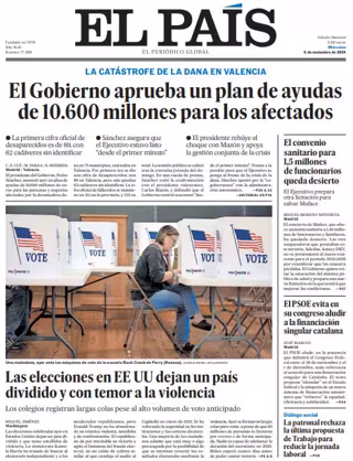 EL PAÍS: "El Gobierno aprueba un plan de ayudas de 10.600 millones para los afectados"; "Las elecciones en EE UU dejan un país dividido y con temor a la violencia"; "El convenio sanitario para 1,5 millones de funcionarios queda desierto"; "El PSOE evita en su congreso aludir a la financiación singular catalana"; "La patronal rechaza la última propuesta de Trabajo para reducir la jornada laboral".