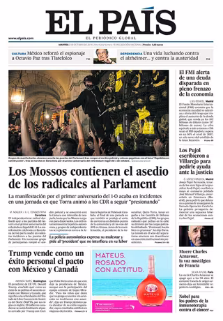 EL PAÍS: "Los Mossos contienen el asedio de los radicales al Parlament"; "Trump vende como un éxito personal el pacto con México y Canadá"; "El FMI alerta de una deuda disparada en pleno frenazo de la economía"; "Los Pujol escribieron a Villarejo para pedirle ayuda ante la justicia".