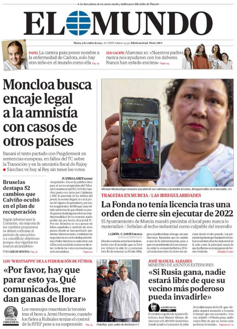 EL MUNDO: "Moncloa busca encaje legal a la amnistía con casos de otros países""; "La Fonda no tenía licencia tras una orden de cierre sin ejecutar de 2022"; "José Manuel Albares: "Si Rusia gana, nadie estará libre de que su vecino más poderoso pueda invadirle""; "Bruselas destapa 52 campos que Calviño ocultó en el plan de recuperación"; ""Por favor, hay que parar esto ya. Qué comunicados, me dan ganas de llorar"".
