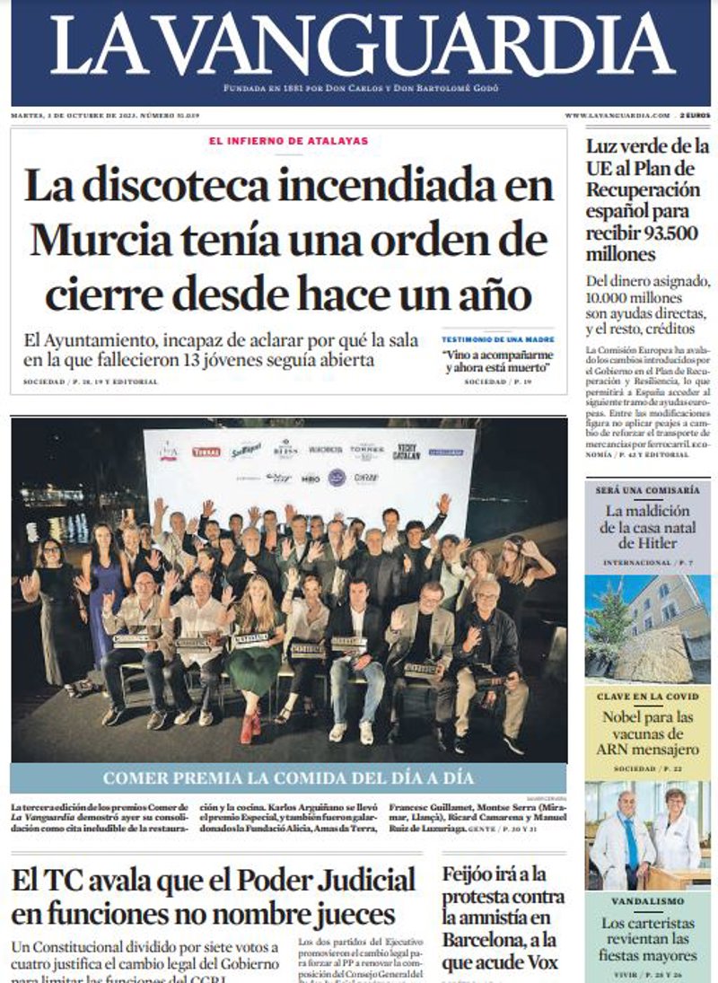 LA VANGUARDIA: "La discoteca incendiada en Murcia tenía una orden de cierre desde hace un año"; "El TC avala que el Poder Judicial en funciones no nombre jueces"; "Luz verde de la UE al Plan de Recuperación español para recibir 93.500 millones".