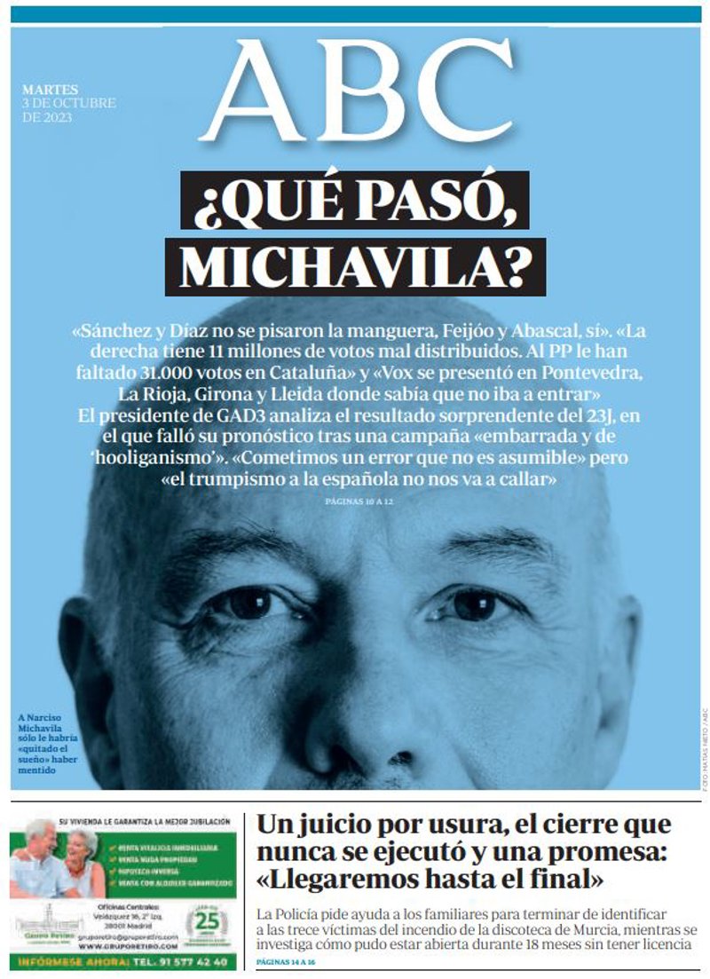 ABC: "¿Qué pasó, Michavila? "Sánchez y Díaz no se pisaron la manguera, Feijóo y Abascal, sí". "La derecha tiene 11 millones de votos mal distribuidos. Al PP le han faltado 31.000 votos en Cataluña" y "Vox se presentó en Pontevedra, La Rioja, Girona y Lleida donde sabía que no iba a entrar". El presidente de GAD3 analiza el resultado sorprendente del 23J, en el que falló su pronóstico tras una campaña "embarrada y de 'hooliganismo'". "Cometimos un error que no es asumible" pero "el trumpismo a la española no nos va a callar""; "Un juicio por usura, el cierre que nunca se ejecutó y una promesa: "Llegaremos hasta el final"".