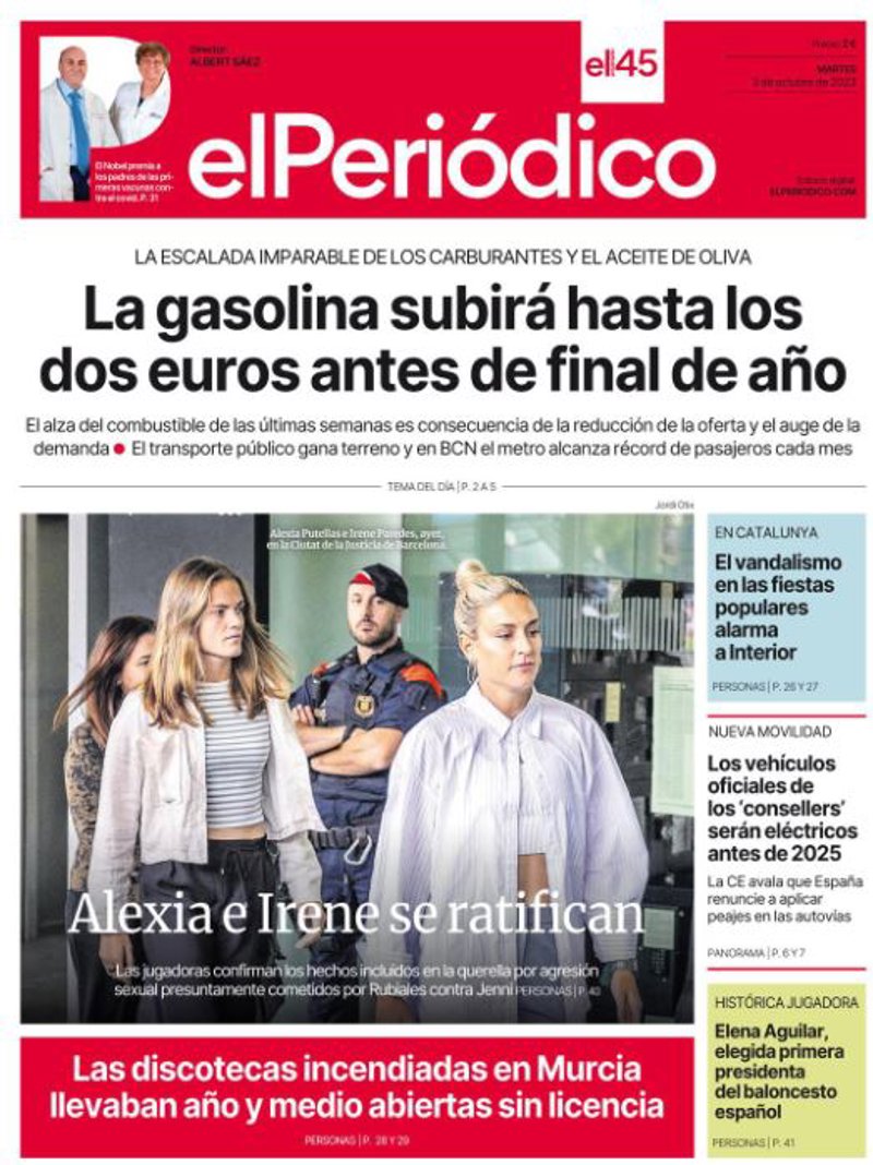 EL PERIÓDICO: "La gasolina subirá hasta los dos euros antes de final de año"; "Alexia e Irene se ratifican"; "Las discotecas incendiadas en Murcia llevaban año y medio abiertas sin licencia"; "El vandalismo en las fiestas populares alarma a Interior": "Los vehículos oficiales de los 'consellers' serán eléctricos antes de 2025"; "Elena Aguilar, elegida primera presidenta del baloncesto español".