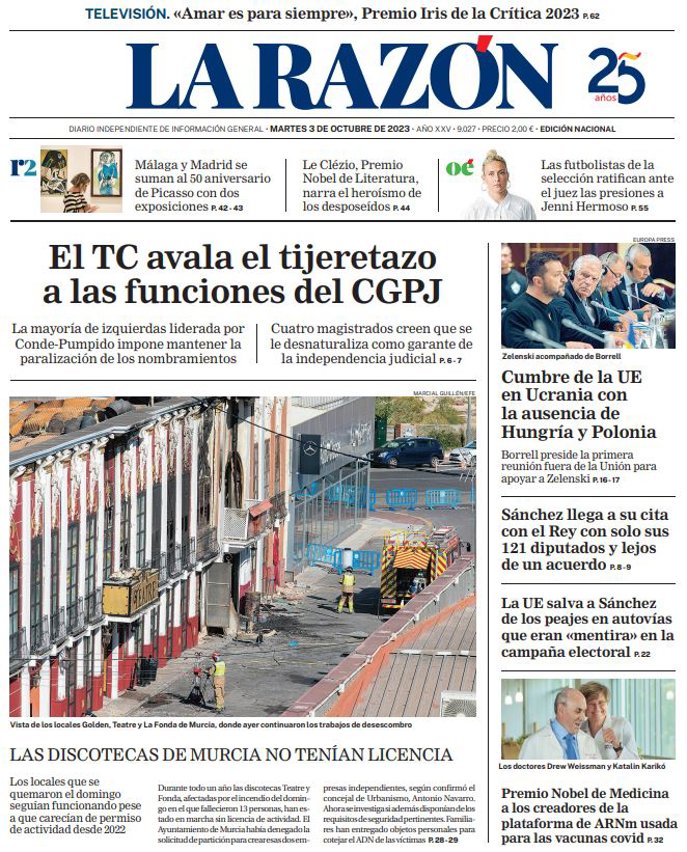 LA RAZÓN: "El TC avala el tijeretazo a las funciones del CGPJ"; "Cumbre de la UE en Ucrania con la ausencia de Hungría y Polonia"; "Sánchez llega a su cita con el Rey con solo sus 121 diputados y lejos de un acuerdo"; "La UE salva a Sánchez de los peajes en autovías que eran "mentira" en la campaña electoral"; "Premio Nobel de Medicina a los creadores de la plataforma de ARNm usada para las vacunas covid".