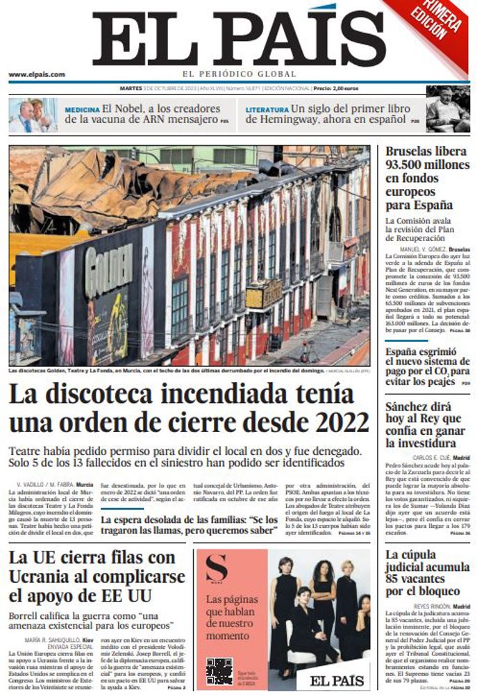 EL PAÍS: "La discoteca incendiada tenía una orden de cierre desde 2022"; "La UE cierra filas con Ucrania al complicarse el apoyo de EE UU"; "Bruselas libera 93.500 millones en fondos europeos para España"; "España esgrimió el nuevo sistema de pago por el CO2para