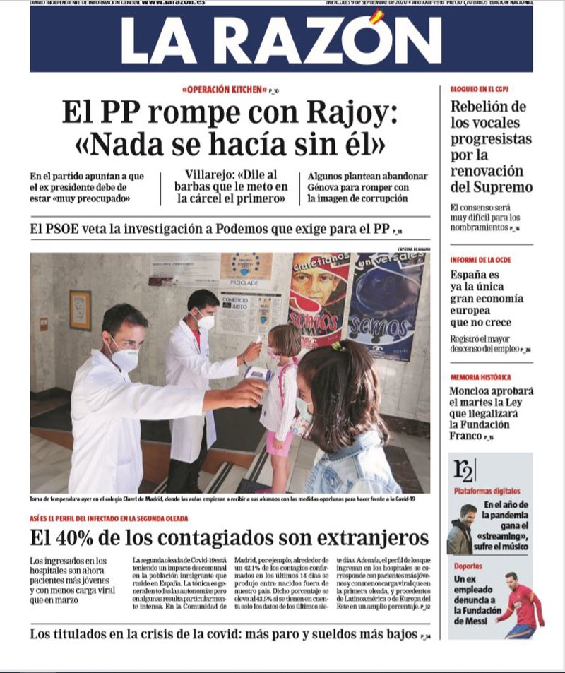 LA RAZÓN: "El PP rompe con Rajoy: "Nada se hacía sin él". El PSOE veta la investigación a Podemos que exige para el PP"; "El 40% de los contagiados son extranjeros. Los titulados en la crisis de la covid: más paro y sueldos más bajos"; "Rebelión de los vocales progresistas por la renovación del Supremo"; "España es ya la única gran economía europea que no crece"; "Moncloa aprobará el martes la Ley que ilegalizará la Fundación Franco".