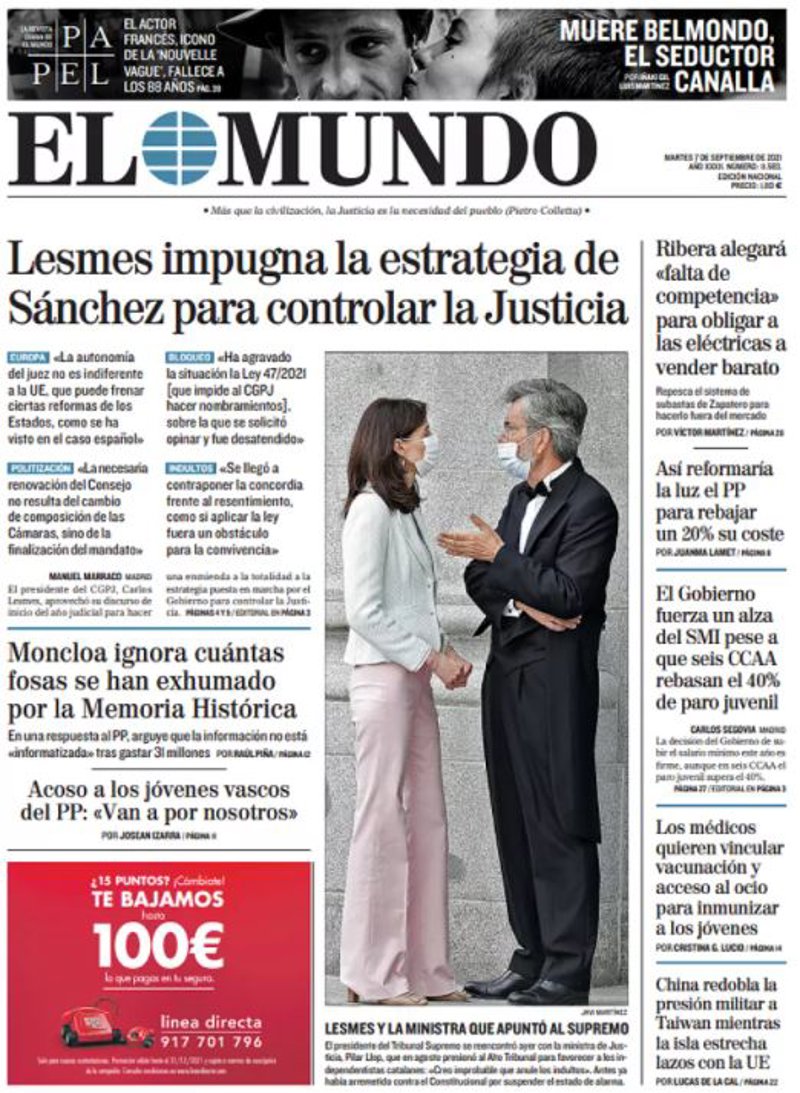 EL MUNDO: "Muere Belmondo, el seductor canalla"; "Lesmes impugna la estrategia de Sánchez para controlar la Justicia"; "Moncloa ignora cuántas fosas se han exhumado por la Memoria Histórica"; "Ribera alegará 'falta de competencia' para obligar a las eléctricas a vender barato"; "Así reformaría la luz el PP para rebajar un 20% su coste"; "El Gobierno fuerza un alza del SMI pese a que seis CCAA rebasan el 40% del paro juvenil"; "Los médicos quieren vincular vacunación y acceso al ocio para inmunizar a los jóvenes"; "China redobla la presión militar a Taiwan mientras la isla estrecha lazos con la UE".