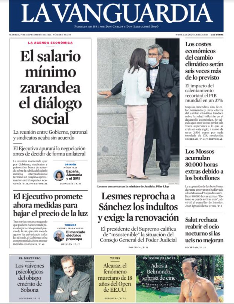LA VANGUARDIA: "El salario mínimo zarandea el diálogo social"; "ElEjecutivo promete ahora medidas para bajar el precio de la luz"; "Lesmes reprocha a Sánchez los indultos y exige la renovación"; "Los costes económicos del cambio climático serán seis veces más de loprevisto"; "Los Mossos acumulan 80.000 horas extras debido a los botellones"; "Salut rechaza reabrir el ocio nocturno si las ucis no mejoran"; "Los vaivenes psicológicos del obispo emérito de Solsona"; "Alcaraz, el fenómeno murciano de 18 años del Open de EE.UU."; "Adiós a Belmondo, sonrisa de cine".