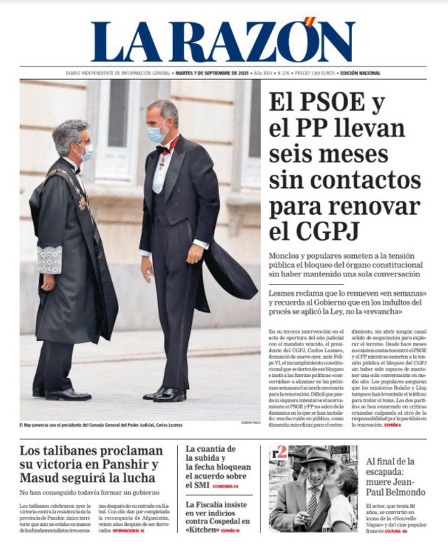 LA RAZÓN: "El PSOE y el PP llevan seis meses sin contactos para renovar el CGPJ"; "Los talibanes proclaman su victoria en Panshir y Masud seguirá la lucha"; "La cuantía de la subida y la fecha bloquean el acuerdo sobre el SMI"; "La Fiscalía insiste en ver indicios contra Cospedal en 'Kitchen'"; "Al fi nal de la escapada: muere Jean-Paul Belmondo".