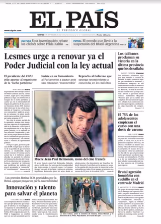 EL PAÍS: "Lesmes urge a renovar ya el Poder Judicial con la ley actual"; "Los talibanes proclaman su victoria en la última provincia que los desafiaba"; "Innovación y talento para salvar el planeta"; "Brutal agresión homófoba con cuchillo en el centro de Madrid"; "Una investigación rebate los clichés sobre Frida Kahlo"; "El enredo que llevó a la suspensión del Brasil-Argentina".