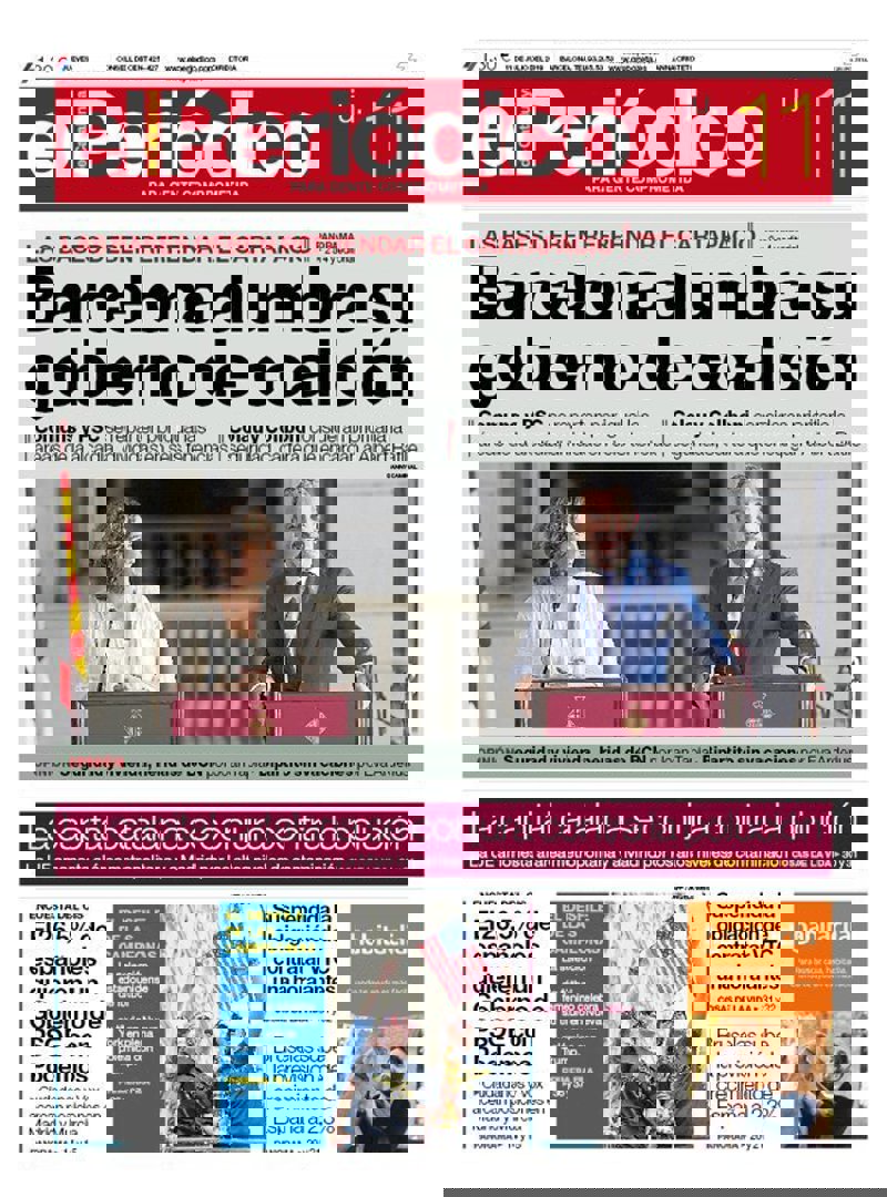 EL PERIÓDICO: "Barcelona alumbra su gobierno de coalición. Comuns y PSC se reparten por igual las áreas de la alcaldía, divididas en seis tenencias"; "La capital catalana se conjura contra la polución"; "El 26,5% de españoles quieren un Gobierno de PSOE con Podemos"; "Suspendida la obligación de contratar VTC una hora antes"; "Bruselas sube la previsión de crecimiento de España al 2,3%".
