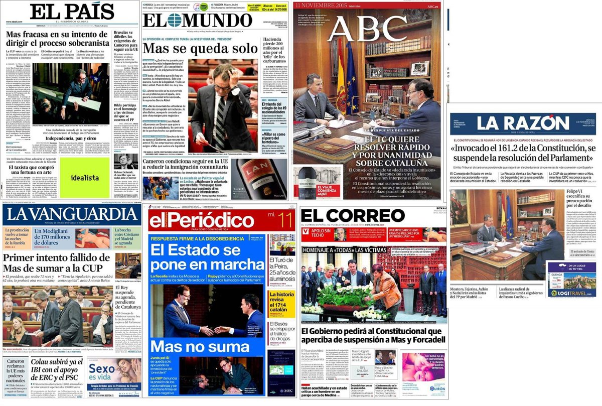 EL MUNDO: "Mas se queda solo. La oposición al completo tumba la investidura del 'president'"; "Cameron condiciona seguir en la UE a reducir la inmigración comunitaria"; "Hacienda pierde 300 millones al año por el 'trile' de los carburantes".