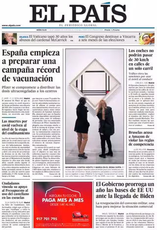 EL PAÍS: "España empieza a preparar una campaña récord de vacunación"; "Las muertes por covid vuelven al nivel de la etapa del confinamiento"; "Ciudadanos vincula su apoyo al Presupuesto al uso del castellano en las escuelas"; "El Gobierno prorroga un año las bases de EE UU ante la llegada de Biden"; "Los coches no podrán pasar de 30 km/h en calles de un solo carril"; "Bruselas acusa a Amazon de violar las reglas de competencia".