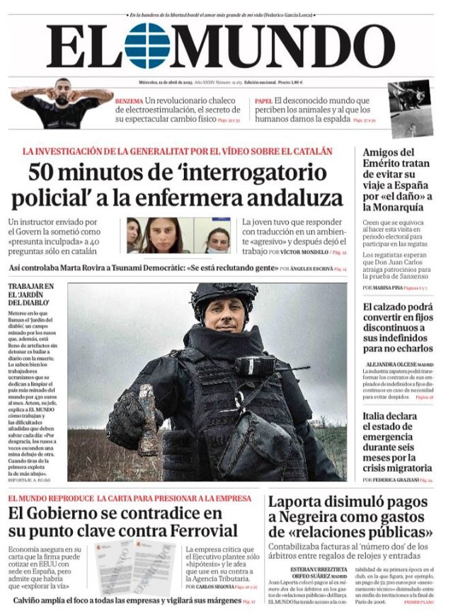 EL MUNDO: "50 minutos de 'interrogatorio policial' a la enfermera andaluza"; "Amigos del Emérito tratan de evitar su viaje a España por el daño a la Monarquía"; "El calzado podrá convertir en fijos discontinuos a sus indefinidos para no echarlos"; "Italia declara el estado de emergencia durante seis meses por la crisis migratoria"; "El Gobierno se contradice en su punto clave contra Ferrovial"; "Laporta disimuló pagos a Negreira como gastos de 'relaciones públicas'".