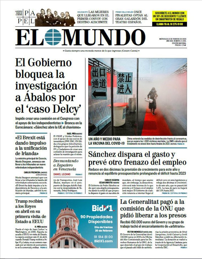EL MUNDO: "El Gobierno bloquea la investigación a Ábalos por el 'caso Delcy'"; "Un año y medio para la vacuna del Covid-19"; "Sánchez dispara el gasto y prevé otro frenazo del empleo"; "La Generalitat pagó a la comisión de la ONU que pidió liberar a los presos"; ""El Brexit está dando impulso a la unificación de Irlanda""; "Trump recibirá a los Reyes en abril en su primera visita de Estado a EEUU".
