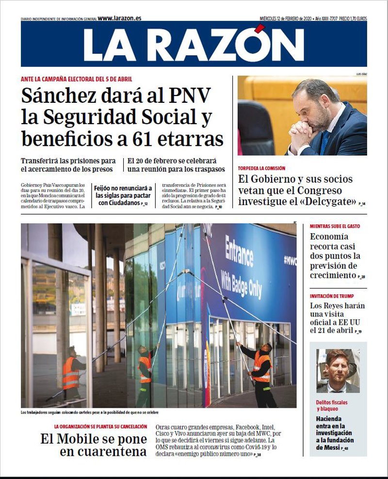 LA RAZÓN: "Sánchez dará al PNV la Seguridad Social y beneficios a 61 etarras. Feijóo no renunciará a las siglas para pactar con Ciudadanos"; "El Mobile se pone en cuarentena"; "Economía recorta casi dos puntos la previsión de crecimiento"; "Los Reyes harán una visita oficial a EEUU el 21 de abril"; "Hacienda entra en la investigación a la fundación de Messi".