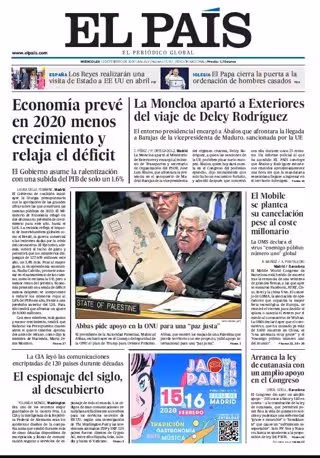 EL PAÍS: "Economía prevé en 2020 menos crecimiento y relaja el déficit"; "La Moncloa apartó a Exteriores del vieja de Delcy Rodríguez"; "Abbas pide apoyo a la ONU para una "paz justa""; "El Mobile se plantea su cancelación pese al coste millonario"; "El espionaje del siglo, al descubierto. La CIA leyó las comunicaciones encriptadas de 120 países durante décadas"; "Arranca la ley de la eutanasia con un amplio apoyo en el Congreso".