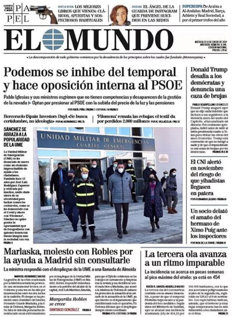 EL MUNDO: "Podemos se inhibe del temporal y hace oposición interna al PSOE"; "Sánchez se abraza a la popularidad de la UME"; "Marlaska, molesto con Robles por la ayuda a Madrid sin consultarle"; "Donald Trump desafía a los demócratas y denuncia una caza de brujas"; "El CNI alertó en noviembre del riesgo de que ihadistas llegasen en patera"; "Un socio delató el amaño del hermano de Ximo Puig ante los inspectores"; "La tercera ola avanza a un ritmo imparable".