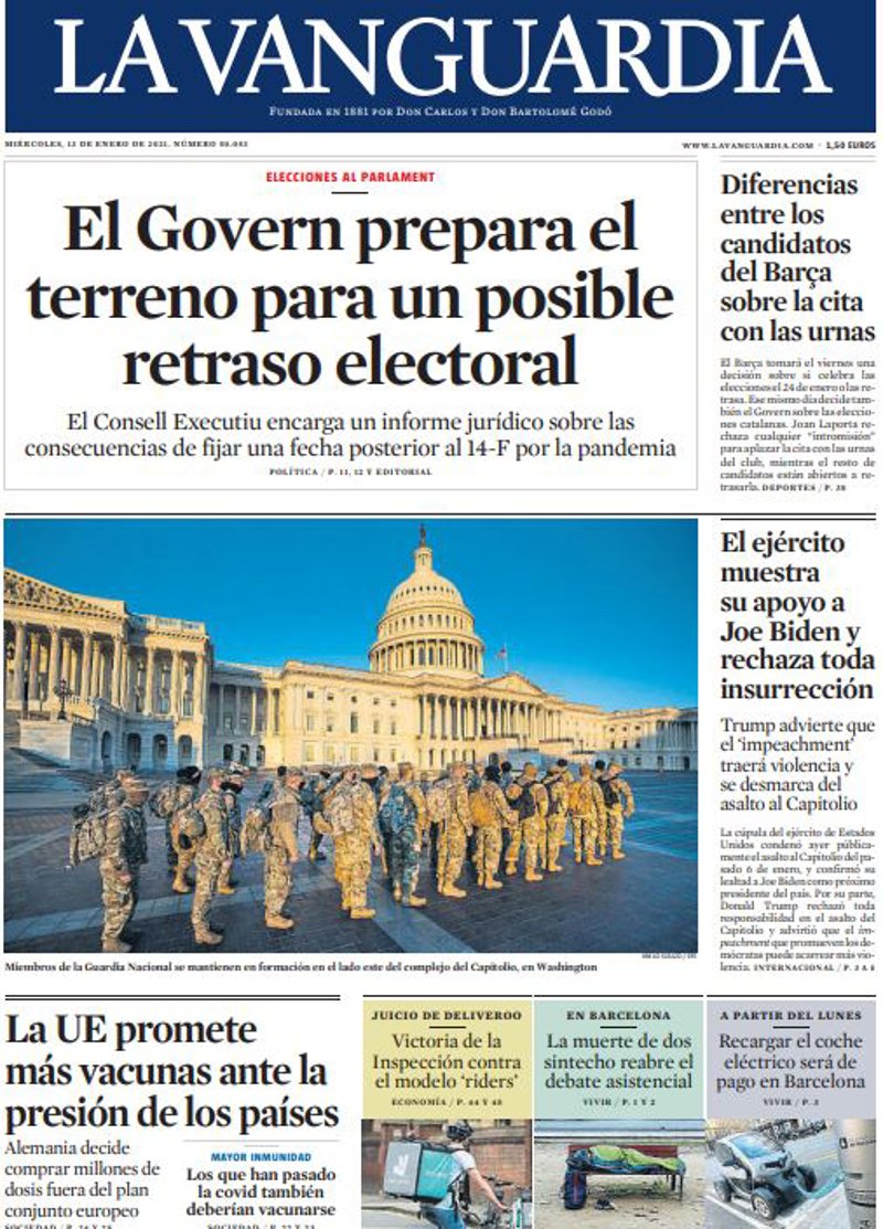 LA VANGUARDIA: "El Govern prepara el terreno para un posible retraso electoral"; "La UE promete más vacunas ante la presión de los países"; "Diferencias entre los candidatos del Barça sobre la cita con las urnas"; "El ejército muestra su apoyo a Joe Biden y rechaza toda insurrección".