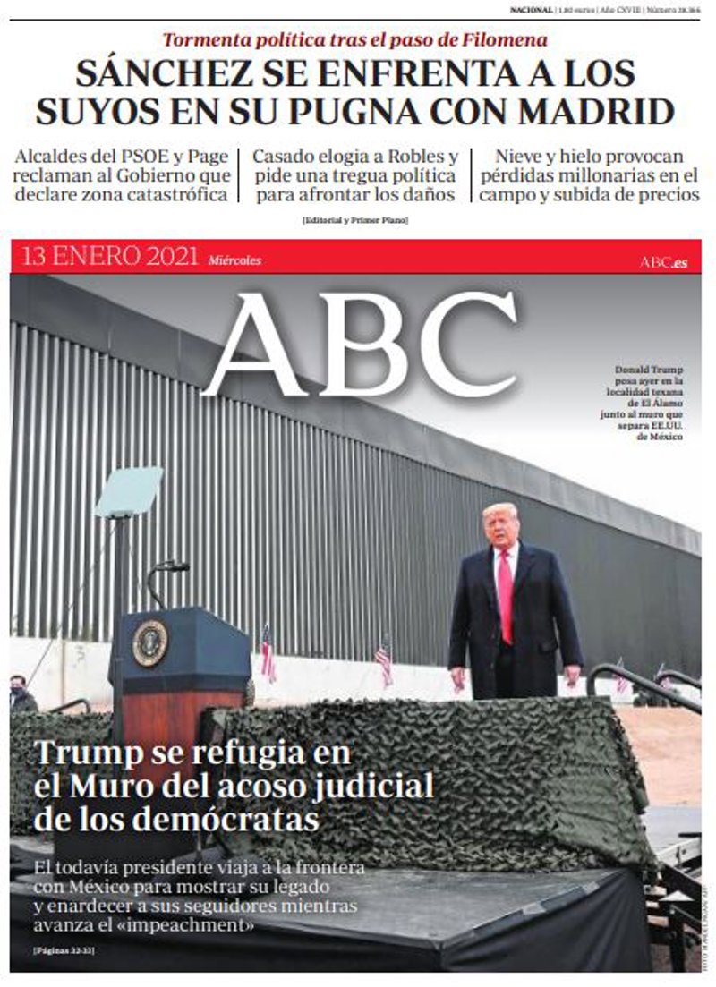 ABC: "Trump se refugia en el Muro del acoso judicial de los demócratas. El todavía presidente viaja a la frontera con México para mostrar su legado y enardecer a sus seguidores mientras avanza el "impeachment""; "Sánchez se enfrenta a los suyos en su pugna por Madrid".