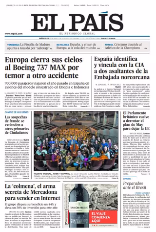 EL PAÍS: "Europa cierra sus cielos al Boeing 737 MAX por temor a otro accidente"; "España identifica y vincula con la CIA a dos asaltantes de la Embajada norcoreana"; "La 'colmena', el arma secreta de Mercadona para vender en Internet"; "El Parlamento británico vuelve a derrotar el plan de May para dejar la UE".