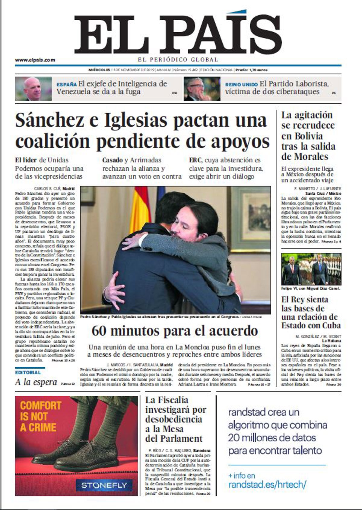 EL PAÍS: "Sánchez e Iglesias pactan una coalición pendiente de apoyos. El líder de Unidas Podemos ocuparía una de las vicepresidencias. 60 minutos para el acuerdo. Una reunión de una hora en La Moncloa puso fin el lunes a meses de desencuentros y reproches entre ambos líderes"; "La agitación se recrudece en Bolivia tras la salida de Morales"; "El Rey sienta las bases de una relación de Estado con Cuba"; "La Fiscalía investigará por desobediencia a la Mesa del Parlament".