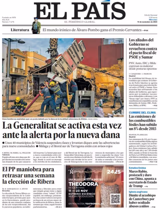 EL PAÍS: "La Generalitat se activa esta vez ante la alerta por la nueva dana"; "El PP maniobra para retrasar una semana la elección de Ribera"; "Los aliados del Gobierno se revuelven contra el pacto fiscal de PSOE y Sumar"; "Las emisiones de los combustibles fósiles han subido un 8% desde 2015"; "Marco Rubio, proisraelí y duro con China, apunta a secretario de Estado de Trump"; "Dimite el arzobispo de Canterbury por haber ocultado abusos a niños".