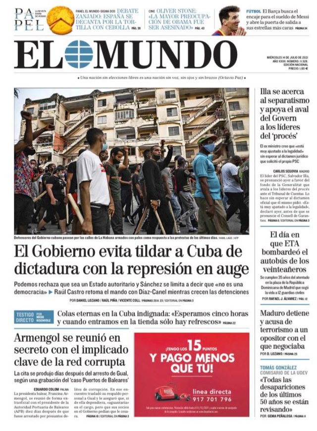 EL MUNDO: "El Gobierno evita tildar a Cuba de dictadura con la represión en auge"; "Armengol se reunió en secreto con el implicado clave de la red corrupta"; "Illa se acerca al separatismo y apoya el aval del Govern a los líderes del 'procés'"; "El día en que ETA bombardeó el autobús de los veinteañeros"; "Maduro detiene y acusa de terrorismo a un opositor con el que negociaba".
