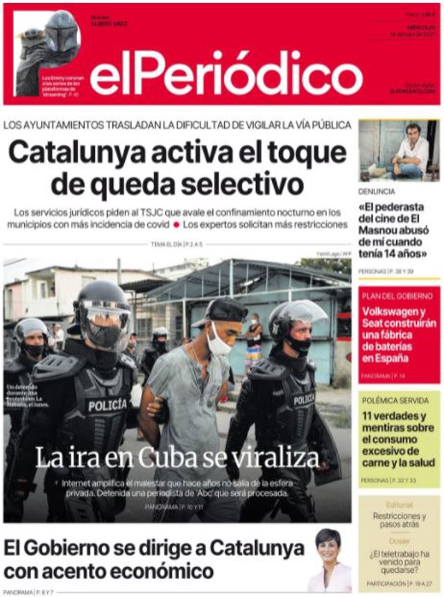 EL PERIÓDICO: "Catalunya activa el toque de queda selectivo"; "El Gobierno se dirige a Catalunya con acento económico"; "Los ayuntamientos trasladan la dificultad de vigilar la vía pública"; "11 verdades y mentiras sobre el consumo excesivo de carne y la salud"; "Volkswagen y Seat construirán una fábrica de baterías en España"; "Denuncia: 'El pederasta del cine de El Masnou abusó de mí cuando tenía 14 años'".
