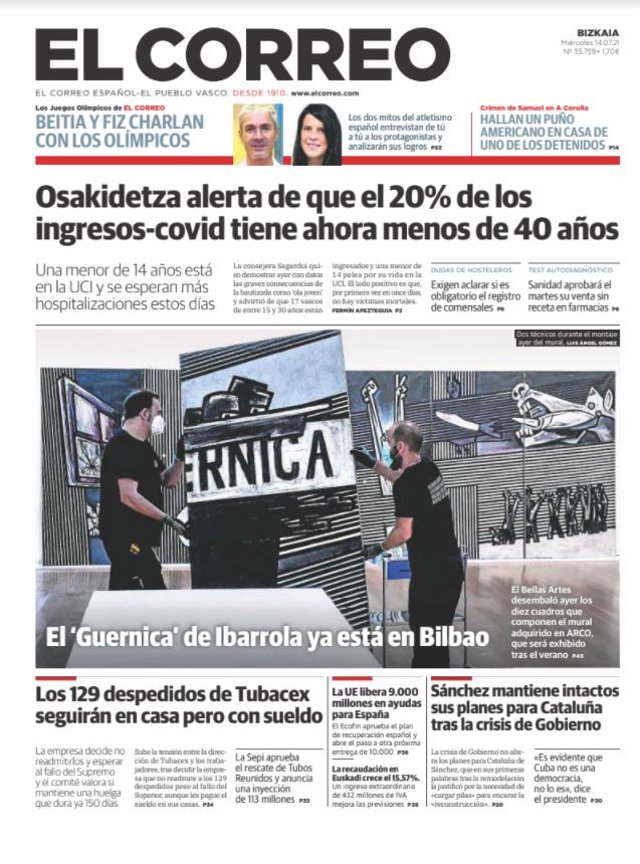 EL CORREO: "Osakidetza alerta de que el 20% de los ingresos-covid tiene ahora menos de 40 años"; "El 'Guernica' de Ibarrola ya está en Bilbao"; "Los 129 despedidos de Tubacex seguirán en casa pero con sueldo"; "La UE libera 9.000 millones en ayudas para España"; "Sánchez mantiene intactos sus planes para Cataluña tras la crisis de Gobierno"; "La recaudación en Euskadi crece el 15,57%".