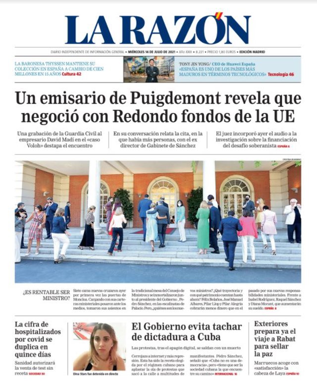 LA RAZÓN: "Un emisario de Puigdemont revela que negoció con Redondo fondos de la UE"; "La cifra de hospitalizados por covid se duplica en quince días"; "El Gobierno evita tachar de dictadura a Cuba"; "Exteriores prepara ya el viaje a Rabat para sellar la paz"; "La Baronesa Thyssen mantiene su colección en España a cambio de cien millones en 15 años".